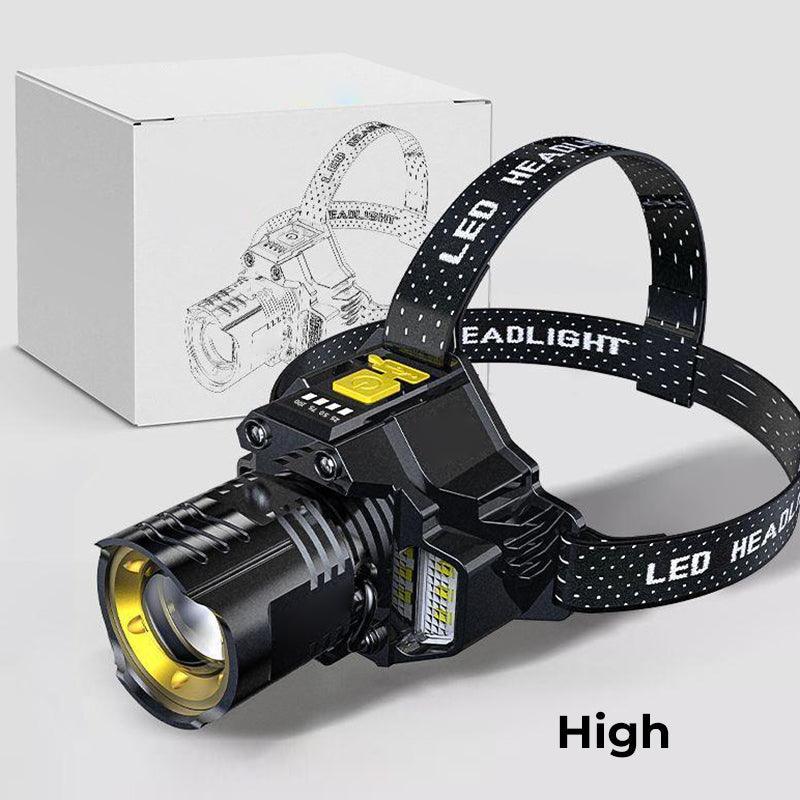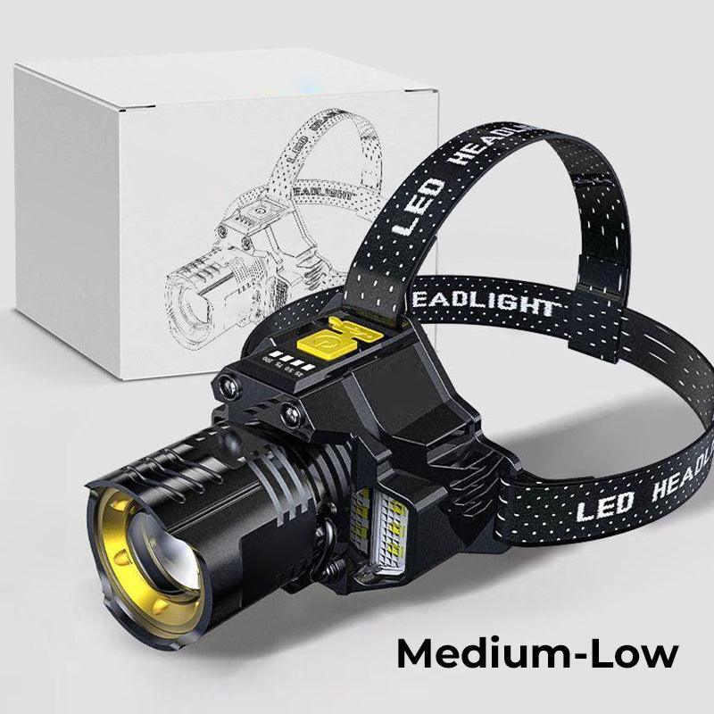 FIVE LIGHT MODES – Adjust your lighting with five adjustable brightness settings: Strong Light, Medium Light, Low Light, COB Light, and Red & Blue Side Lights for warning or signaling in emergencies.
