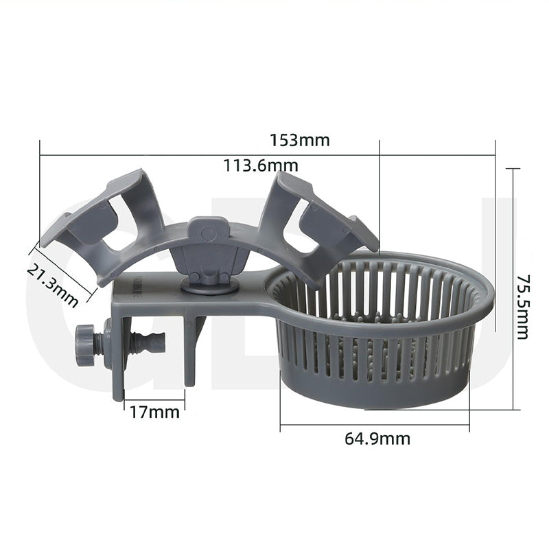 DIMENSIONS: Total Length: 153mm / Pipe Clamp Length: 113.6mm / Base Width: 64.9mm / Height: 75.5mm / Basket Diameter: 21.3mm