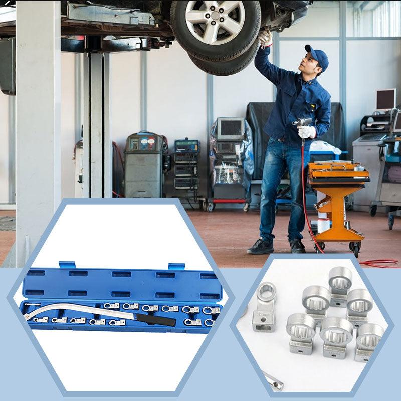 DIVERSE AND COMPREHENSIVE: This complete set comprises 5 E-heads, 8 Plum Sockets, 1 Curved Flat Wrench, and 1 Plug Switch, catering to various automotive belt repair requirements.